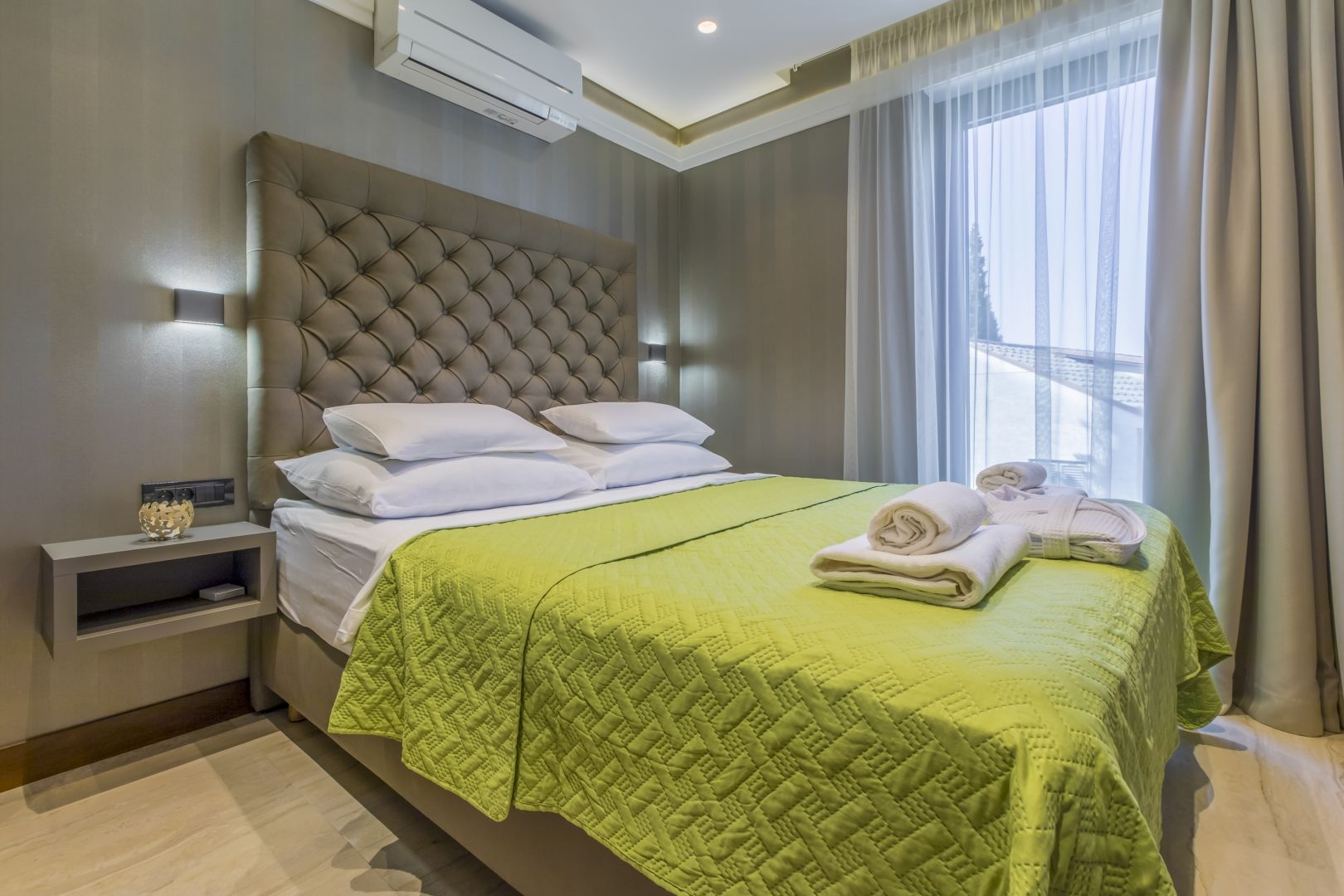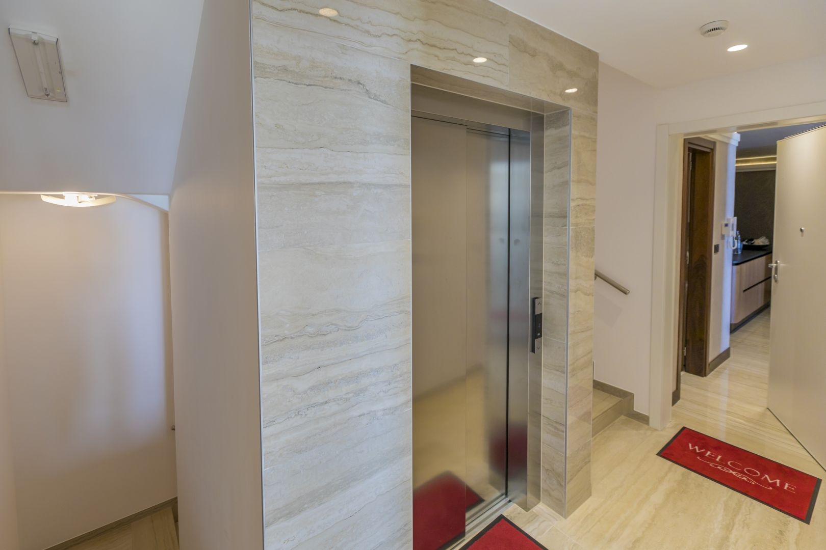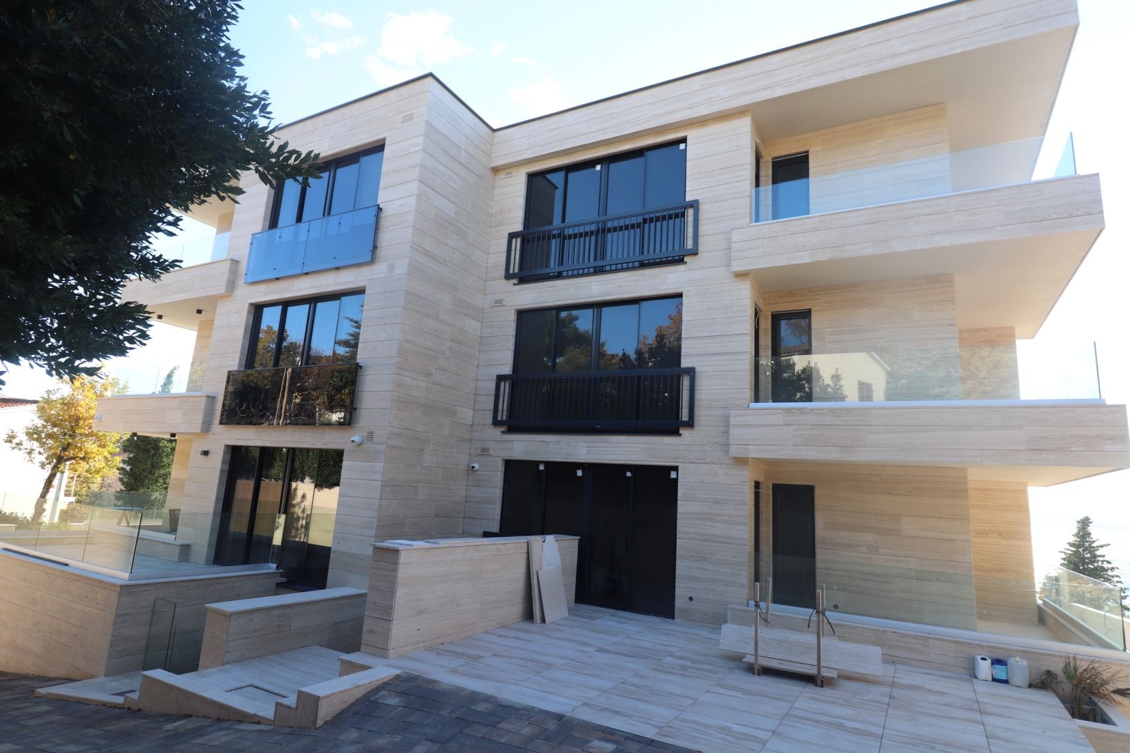 The villa contains the following: built of reinforced concrete structure, built-in panoramic aluminum joinery, built-in elevator, underground garage, underfloor heating, air conditioning cooling Mitsubishi in all rooms, each apartment has storage in the basement, all apartments have their own garden, some apartments have their own swimming pool within the garden, thermally insulated facade ETTICS system d = 10 cm, the entire building is lined with travertine stone, all apartments are fully furnished with well-known brands, within the garden are built aluminum pergolas that open and have their own LED lighting, each apartment has built-in alarm system, the building has built-in video surveillance, all apartments have security doors. This luxury apartment with a living area of 131.85 m2 is located on the second floor of this modern new building.