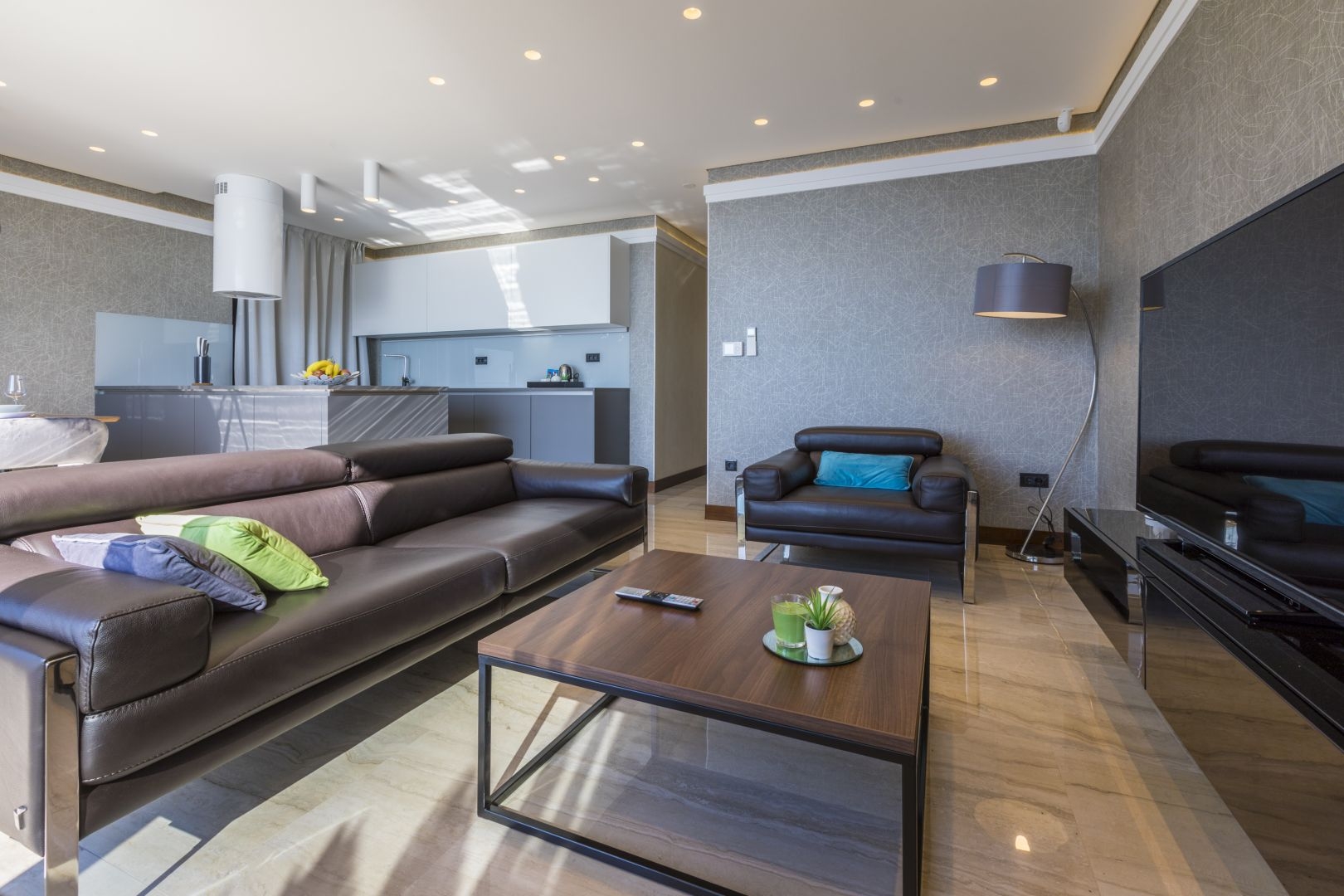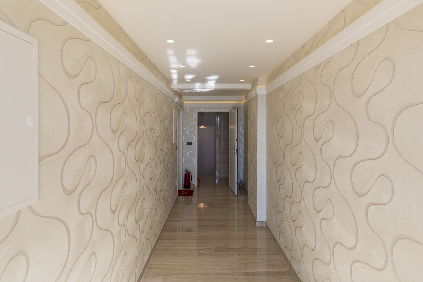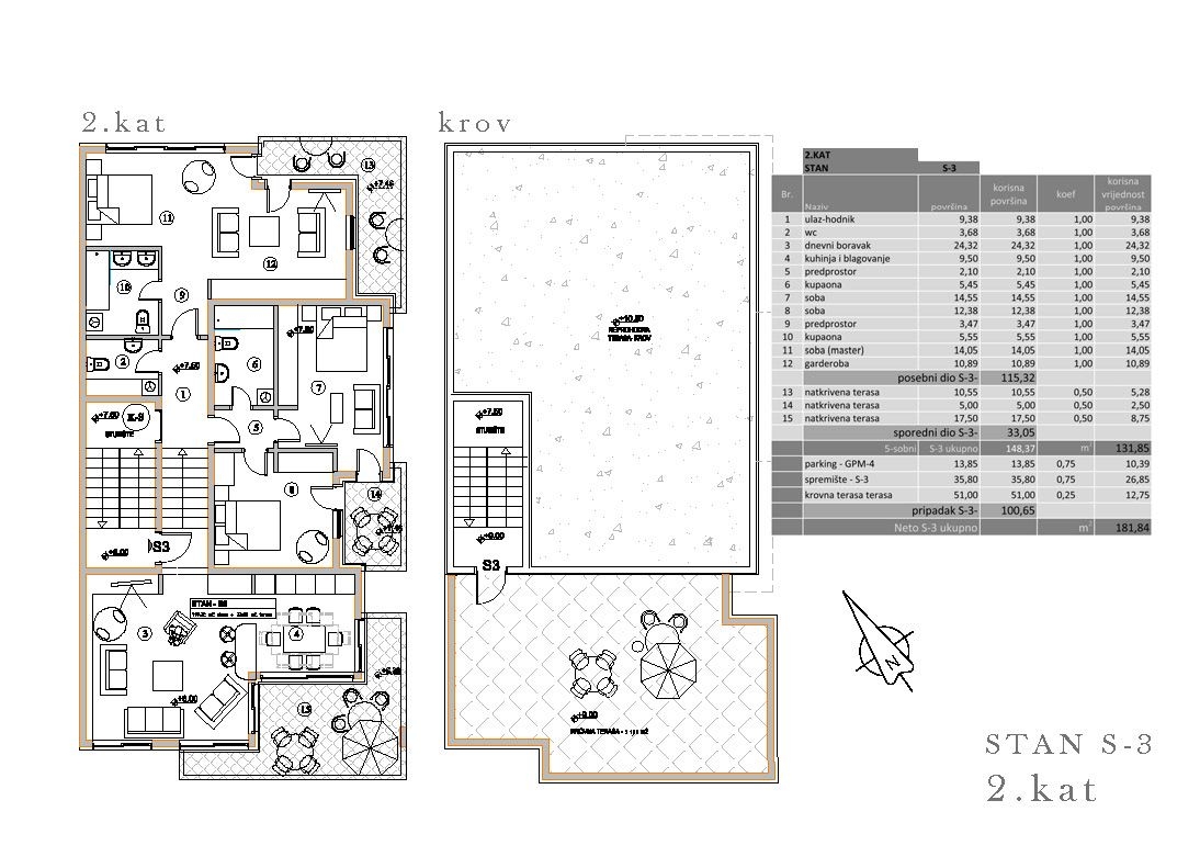 The villa contains the following: built of reinforced concrete structure, built-in panoramic aluminum joinery, built-in elevator, underground garage, underfloor heating, air conditioning cooling Mitsubishi in all rooms, each apartment has storage in the basement, all apartments have their own garden, some apartments have their own swimming pool within the garden, thermally insulated facade ETTICS system d = 10 cm, the entire building is lined with travertine stone, all apartments are fully furnished with well-known brands, within the garden are built aluminum pergolas that open and have their own LED lighting, each apartment has built-in alarm system, the building has built-in video surveillance, all apartments have security doors. This luxury apartment with a living area of 131.85 m2 is located on the second floor of this modern new building.
