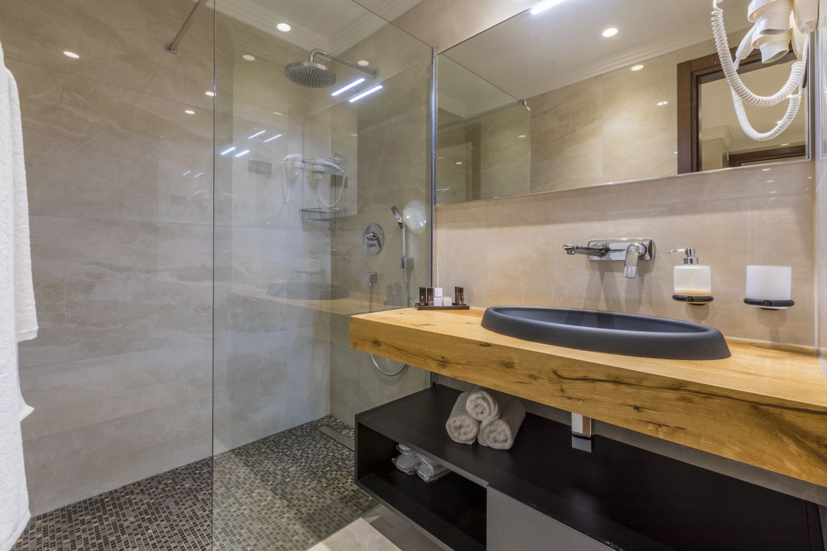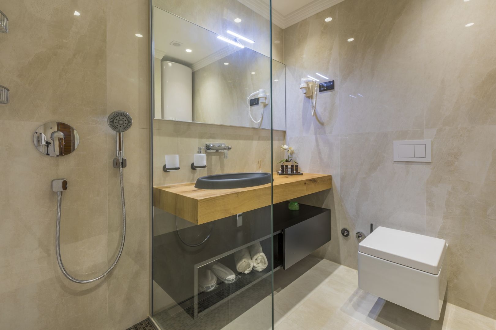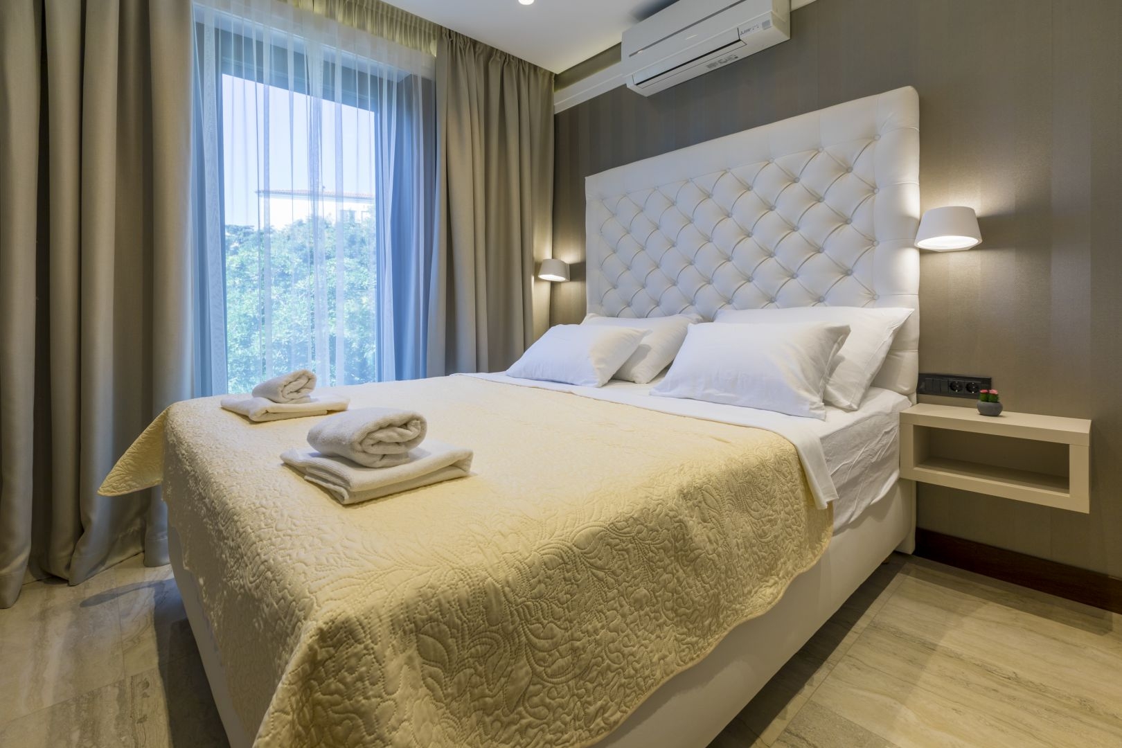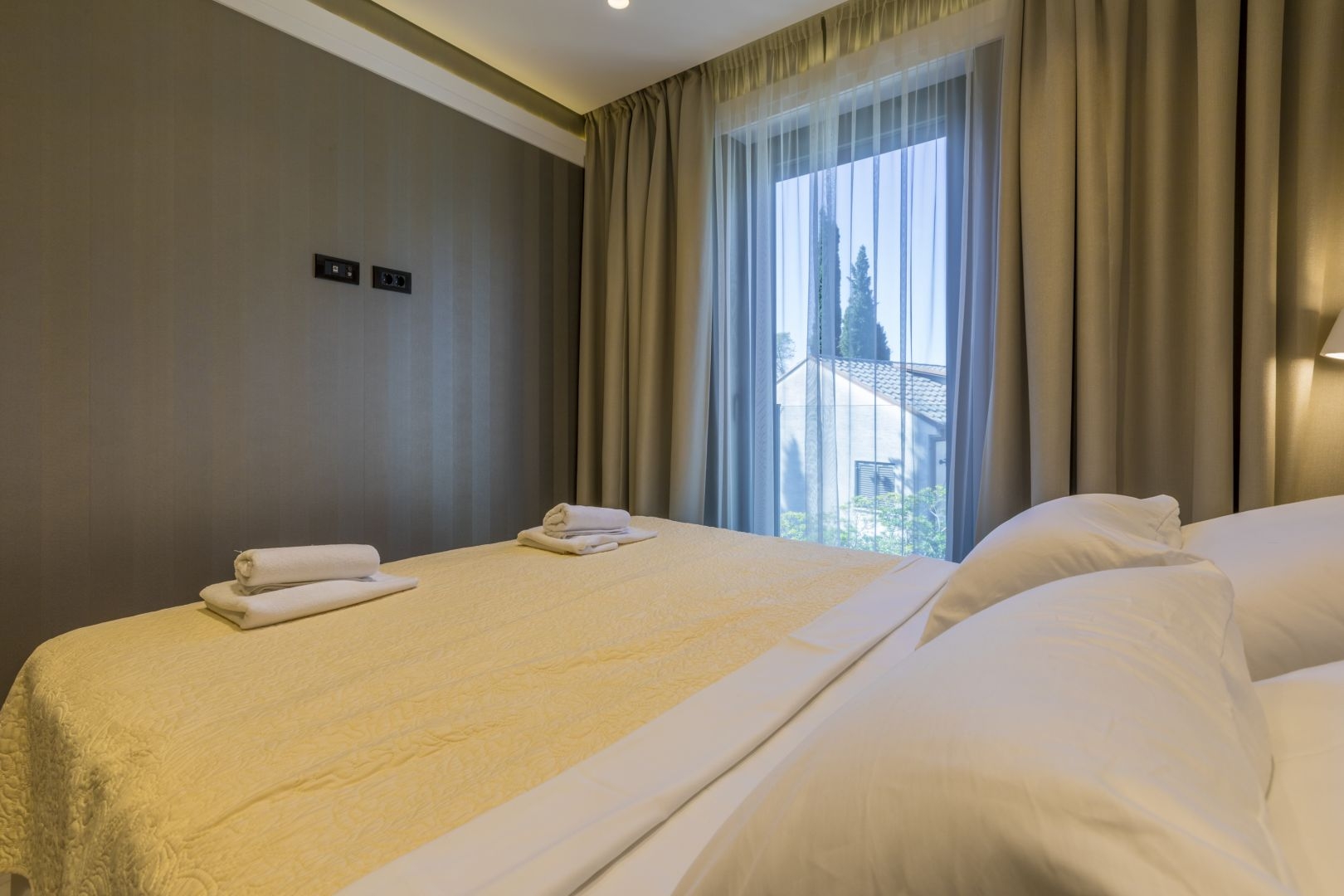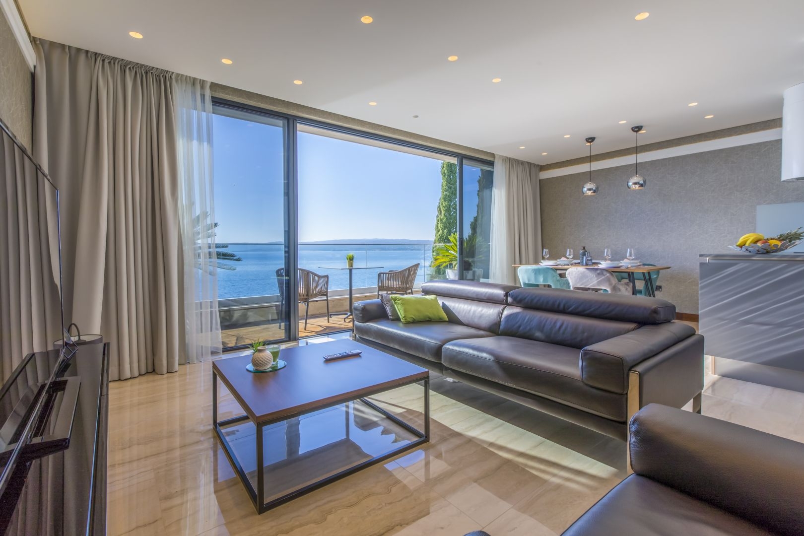 All facilities and apartments are designed so that each apartment has its own part where you can enjoy your own privacy and spend a perfect relaxing holiday. As far as the interior of the buildings is concerned, special emphasis was placed on both quality and aesthetics. The panorama provided will help you to merge with the sea view and to enjoy the connection and continuity of the terrace and the interior of the apartment. As the bathrooms in every apartment are a place of hedonism and a space where beauty and health are restored – your bathroom is also equipped with top quality furniture and sanitary ware.