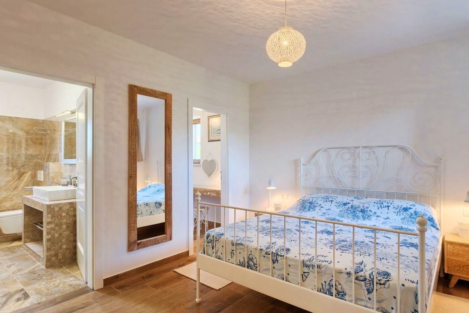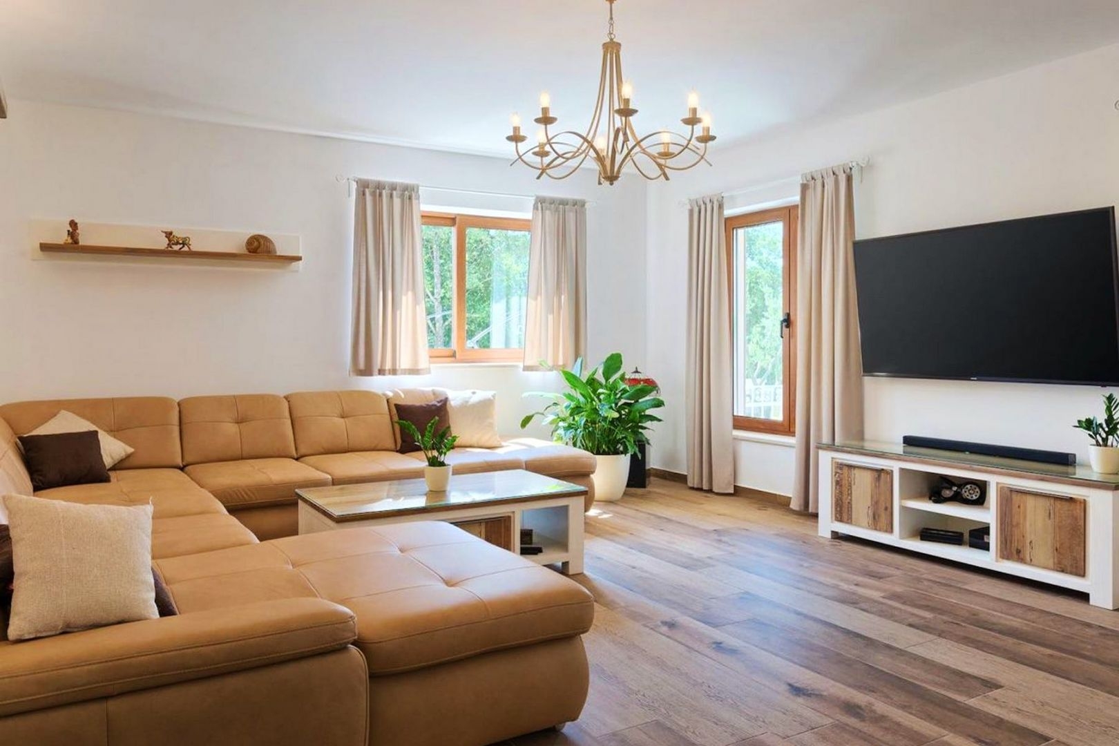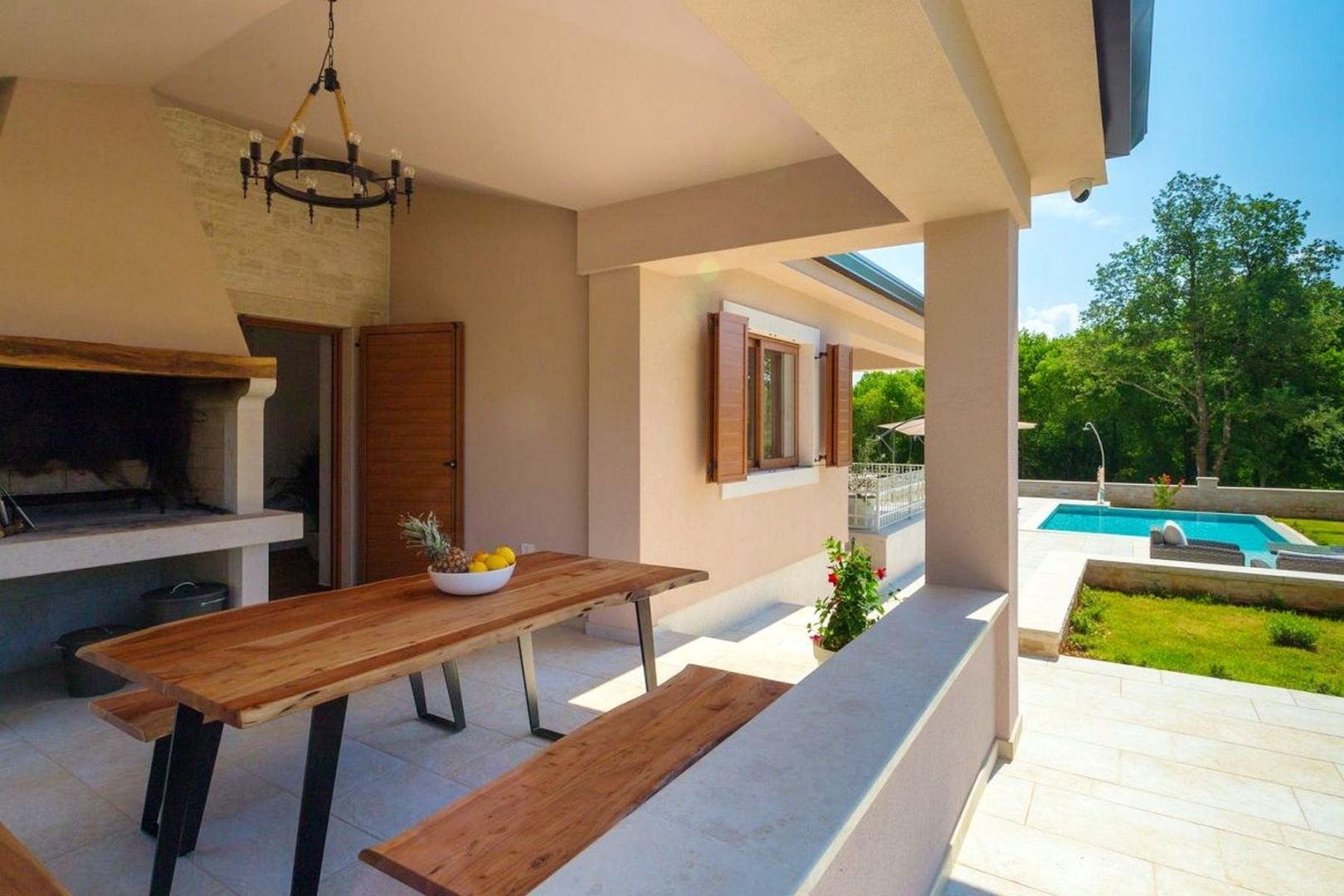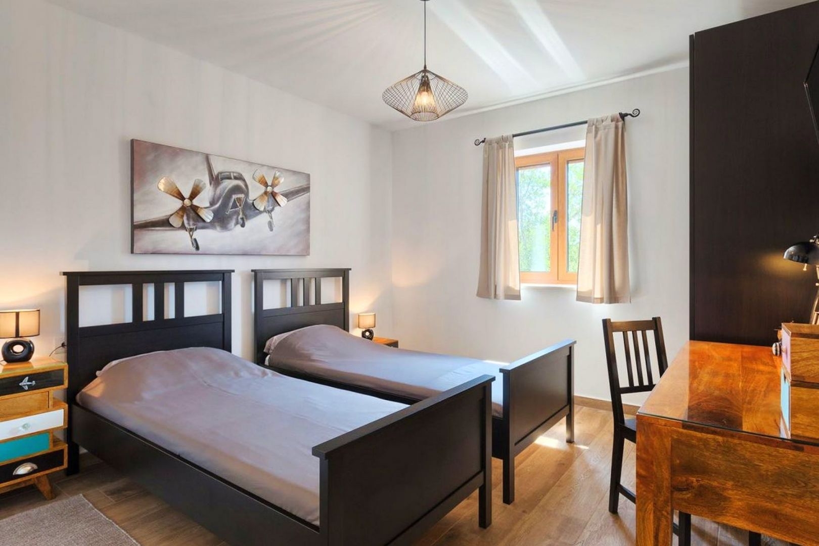 From the ground floor there is a passage to two covered and sunny terraces with its own table for socializing and dining, and one of the terraces has its own barbecue. On the ground floor of the villa is one of the bedrooms with bathroom, as well as a guest toilet. An internal staircase leads to the upper floor, which houses 3 bedrooms, each with its own bathroom. One of the rooms has an additional room where there is currently an additional smaller bed, but the same space can be converted into other necessary purposes, such as walk-in closets and the like. Two of the three bedrooms on the 1st floor have their own terraces with a view of the greenery and the surroundings. What makes the story complete is the beautiful and fully fenced yard of 920m2, ideal for fun with family and friends on a landscaped and maintained green area, which is taken care of by an automatic irrigation system. The yard is additionally adorned with a spacious pool of 33m2 with a shallower part for children and a sun deck, as well as a space for relaxing by the pool.