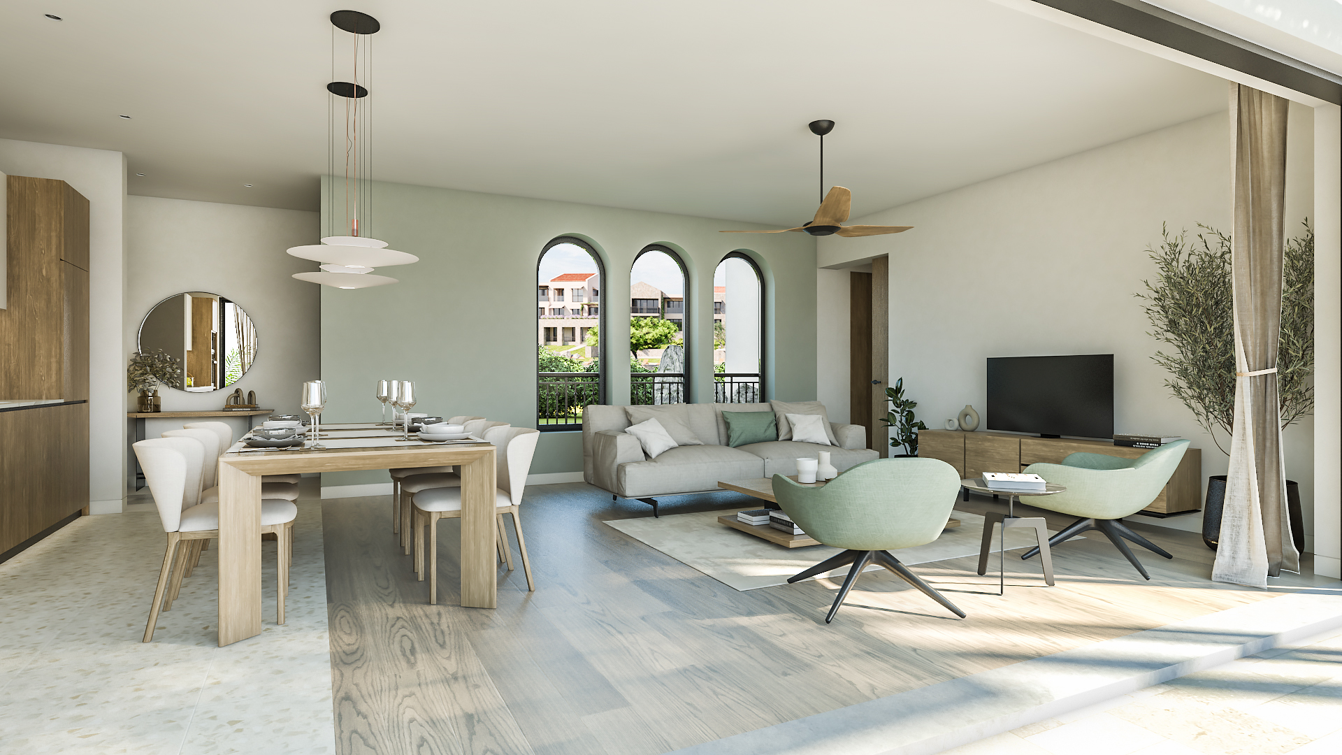 BOTANIKA APARTMENTS: The two-story residential building with a shared pool is located in a beautiful location above the first golf hole. The apartments range from one-bedroom to three-bedroom structures.