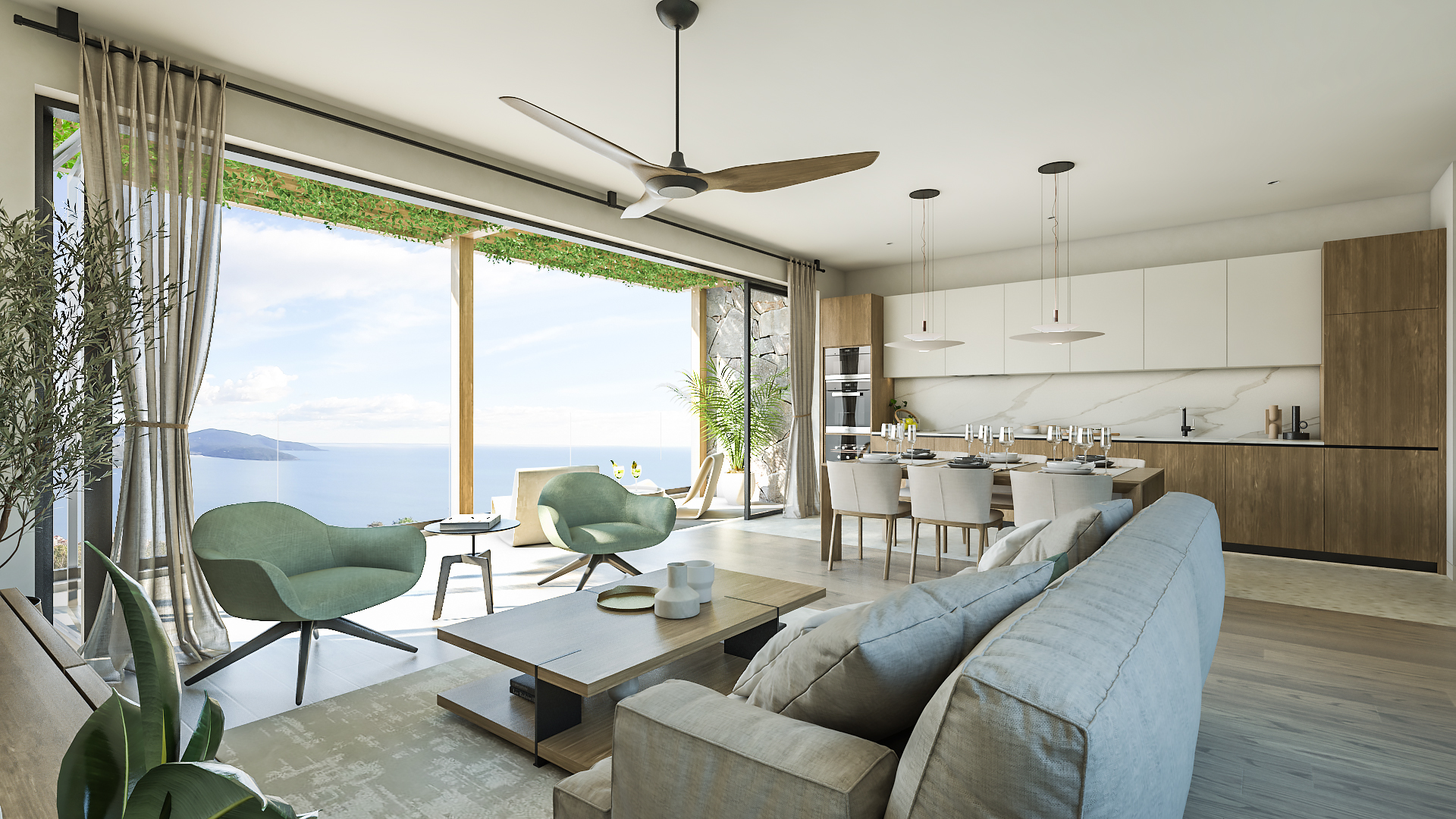 BOTANIKA VILLAS: The elevated location provides an impressive view of the sea and the first golf holes. Large terraces, a private pool, and a garage are part of the spacious outdoor areas. The villas are three-bedroom structures, ranging from 340-440m2 in size.