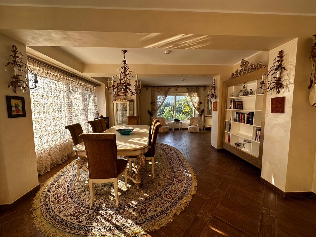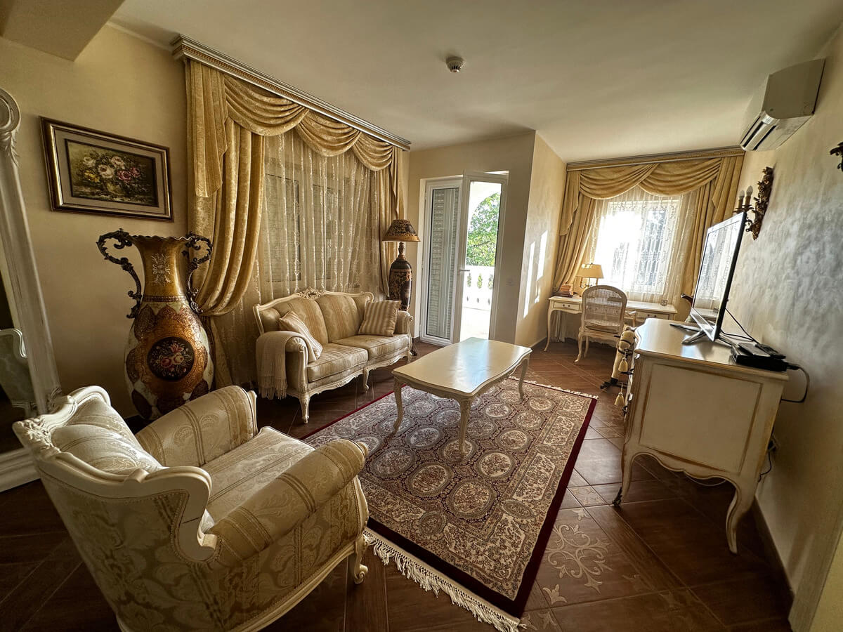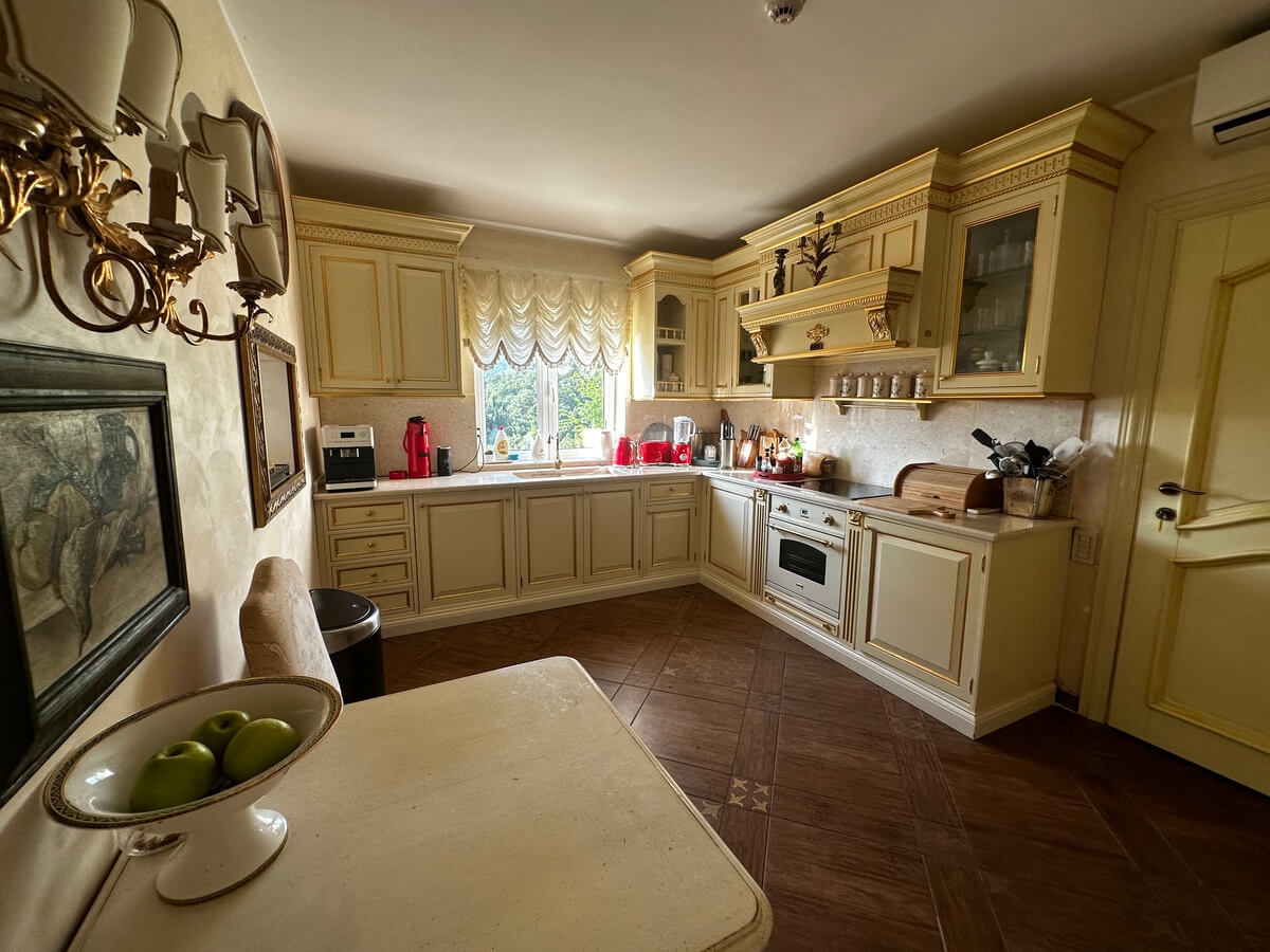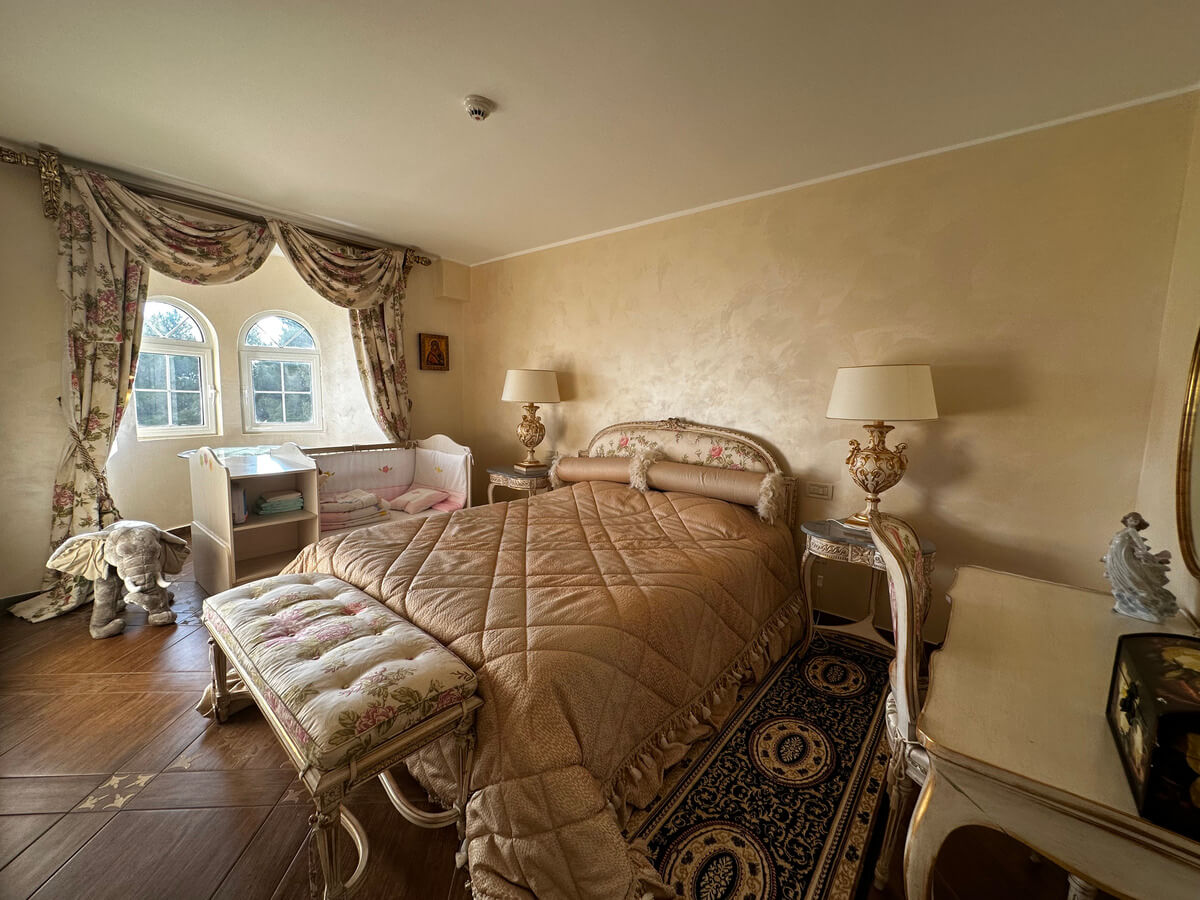On the ground floor, there is a spacious living room with a dining area and a kitchen. A large pool with sun loungers is located in front of the villa on a spacious terrace. The upper floor features four bedrooms with a living room and bathrooms. The interior has been designed by art collectors and includes antique furniture, which is included in the villa’s price. The unique interior design style reflects the baroque and romanticism eras, featuring valuable artworks.