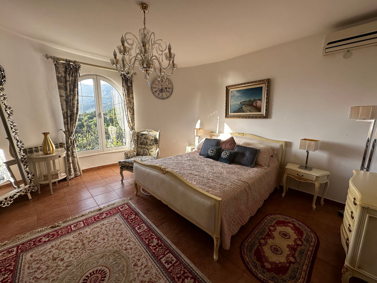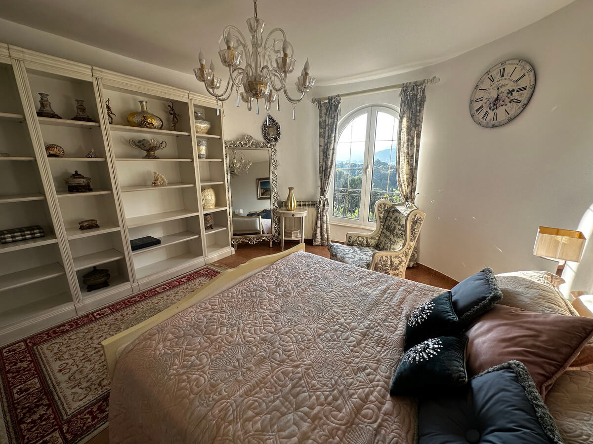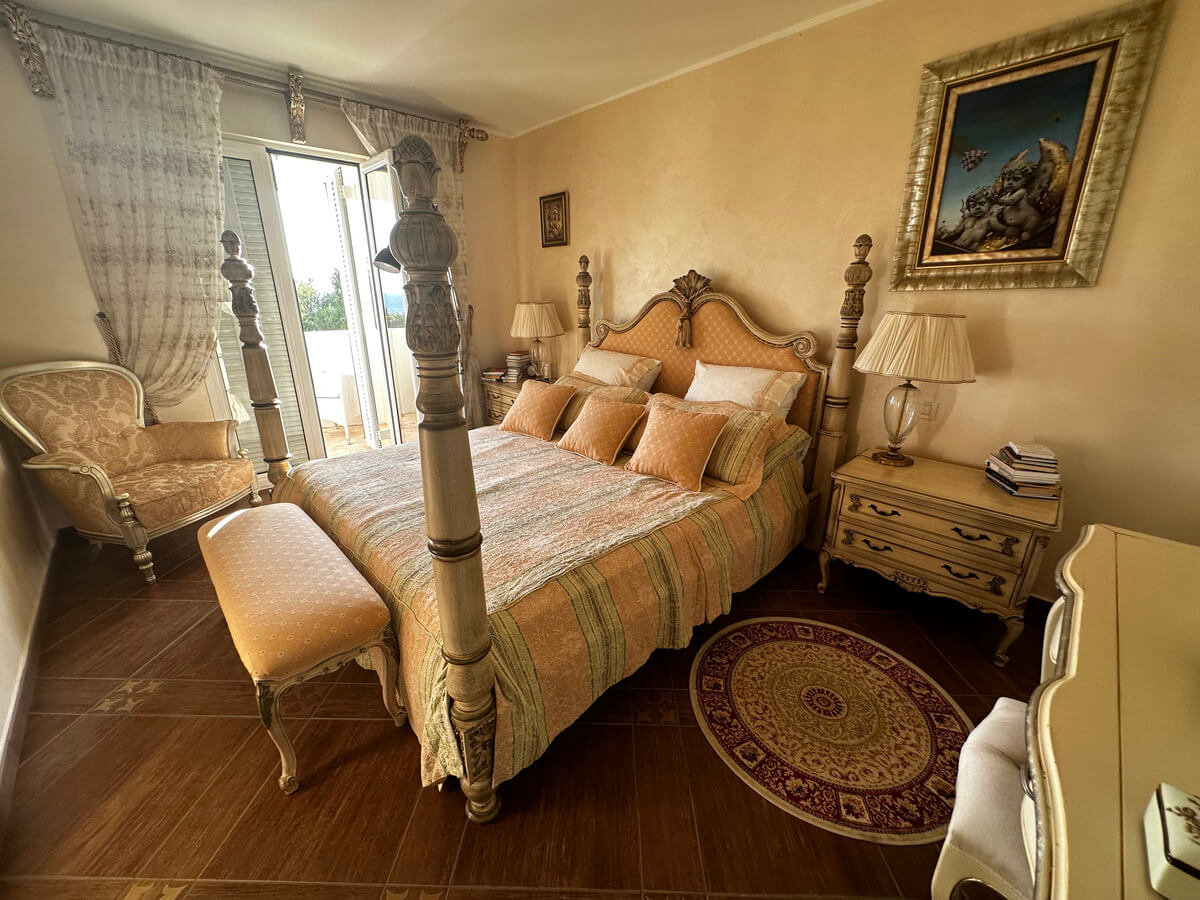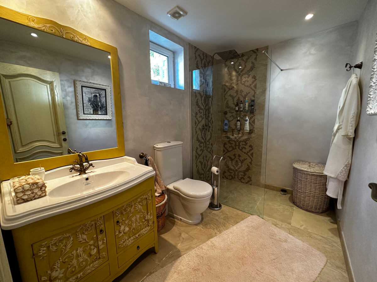 On the ground floor, there is a spacious living room with a dining area and a kitchen. A large pool with sun loungers is located in front of the villa on a spacious terrace. The upper floor features four bedrooms with a living room and bathrooms. The interior has been designed by art collectors and includes antique furniture, which is included in the villa’s price. The unique interior design style reflects the baroque and romanticism eras, featuring valuable artworks.