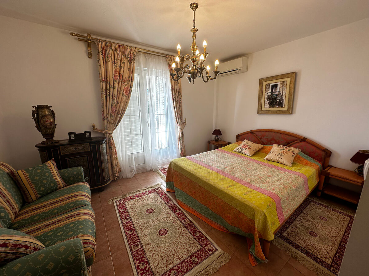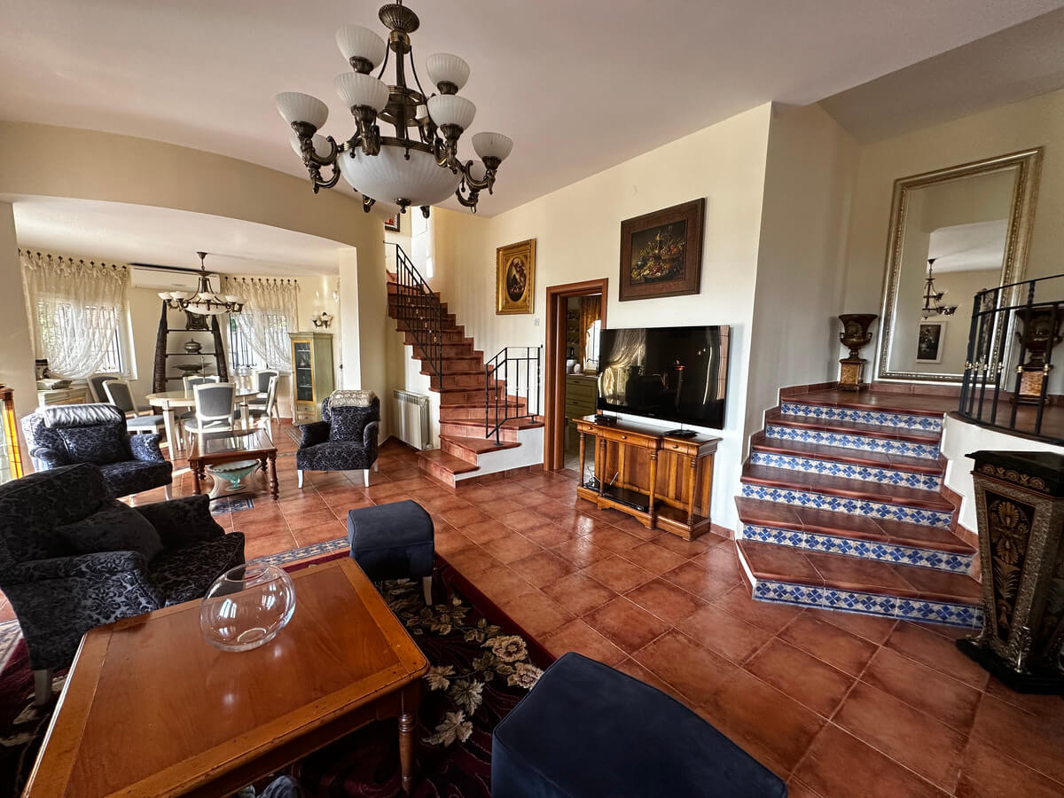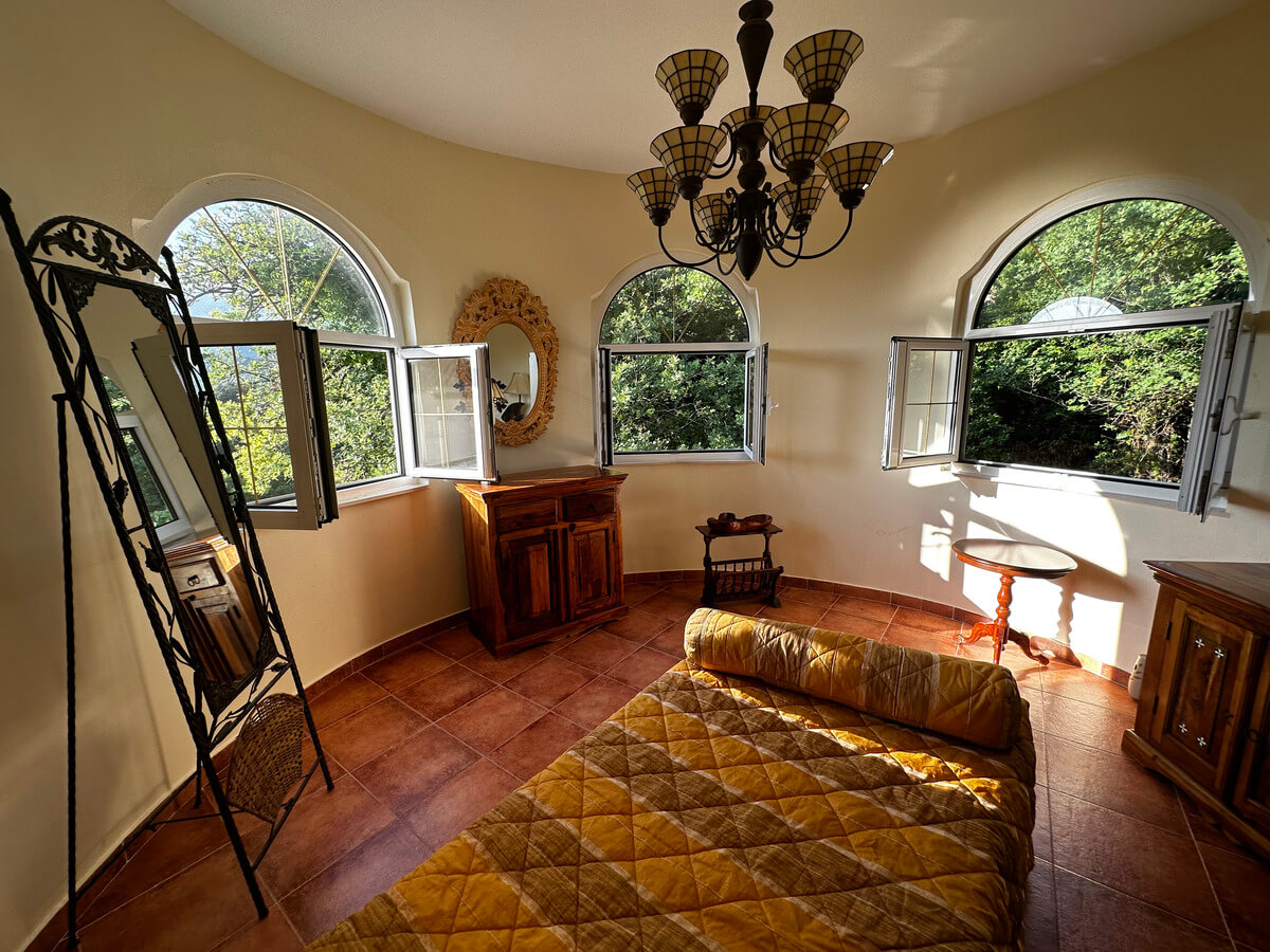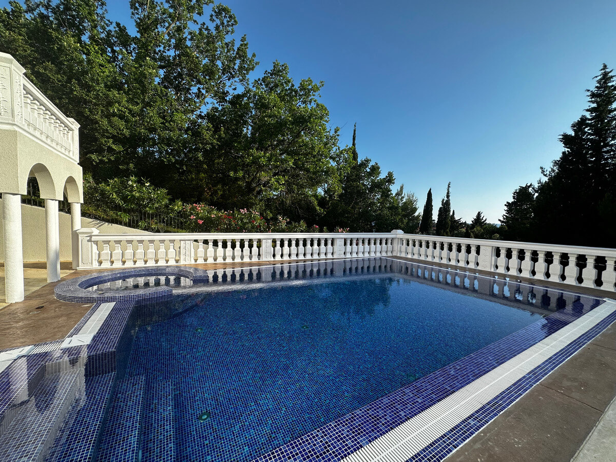 On the ground floor, there is a spacious living room with a dining area and a kitchen. A large pool with sun loungers is located in front of the villa on a spacious terrace. The upper floor features four bedrooms with a living room and bathrooms. The interior has been designed by art collectors and includes antique furniture, which is included in the villa’s price. The unique interior design style reflects the baroque and romanticism eras, featuring valuable artworks.