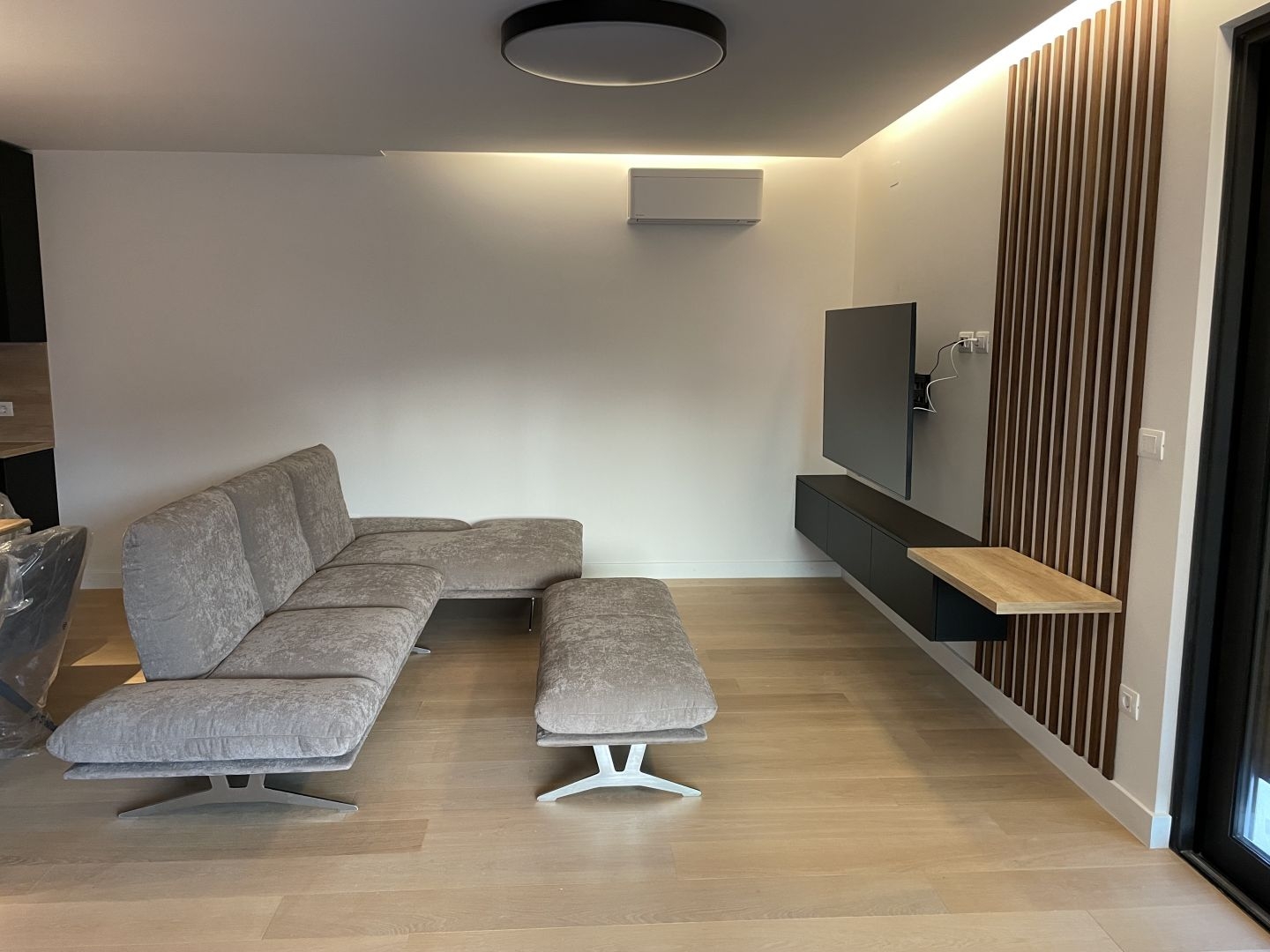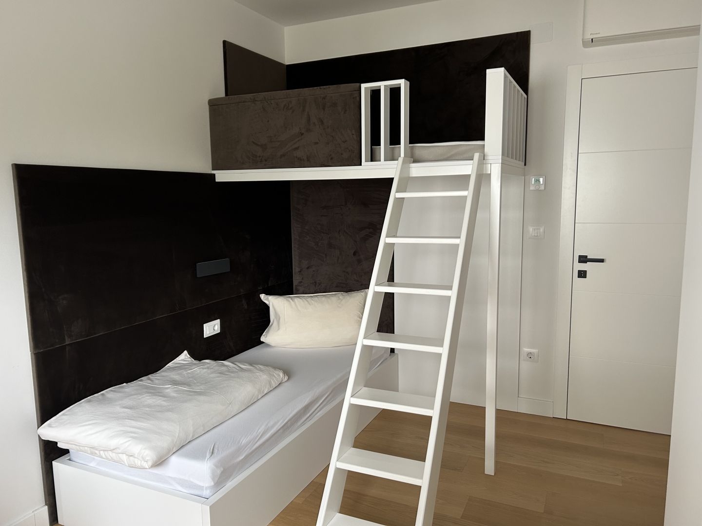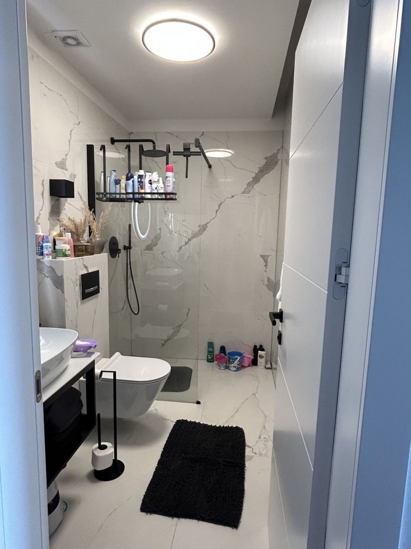 The apartment is fully furnished and equipped, and it features underfloor heating powered by heat pumps. It is also fully air-conditioned.