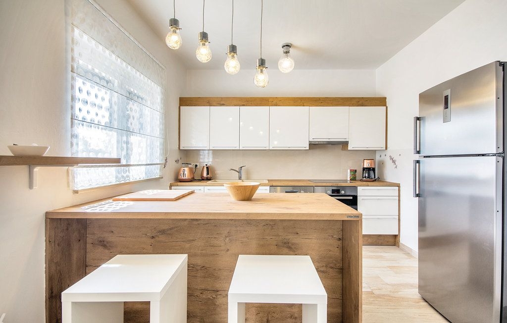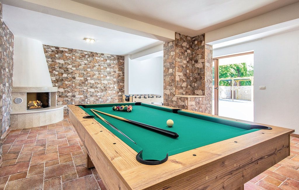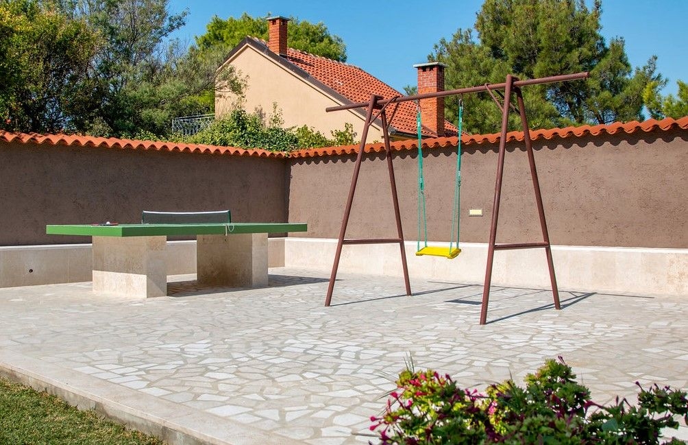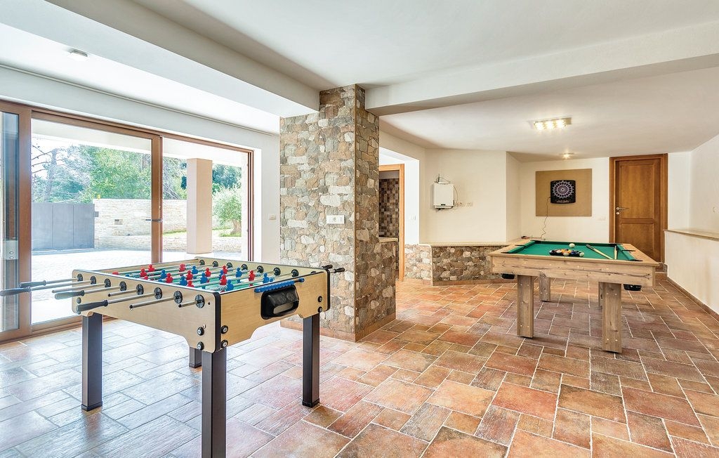 U prizemlju se nalazi konoba (prostor za druženje) sa kaminom, toalet, spremište i tehnička prostorija.