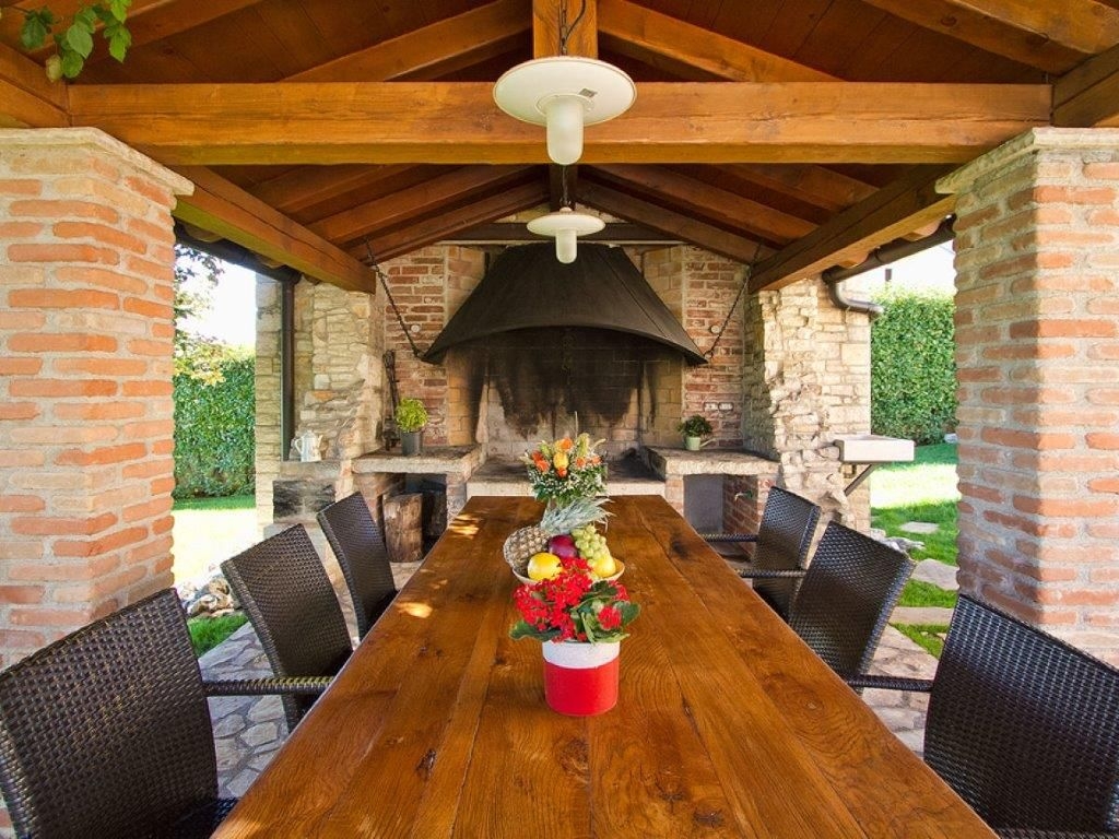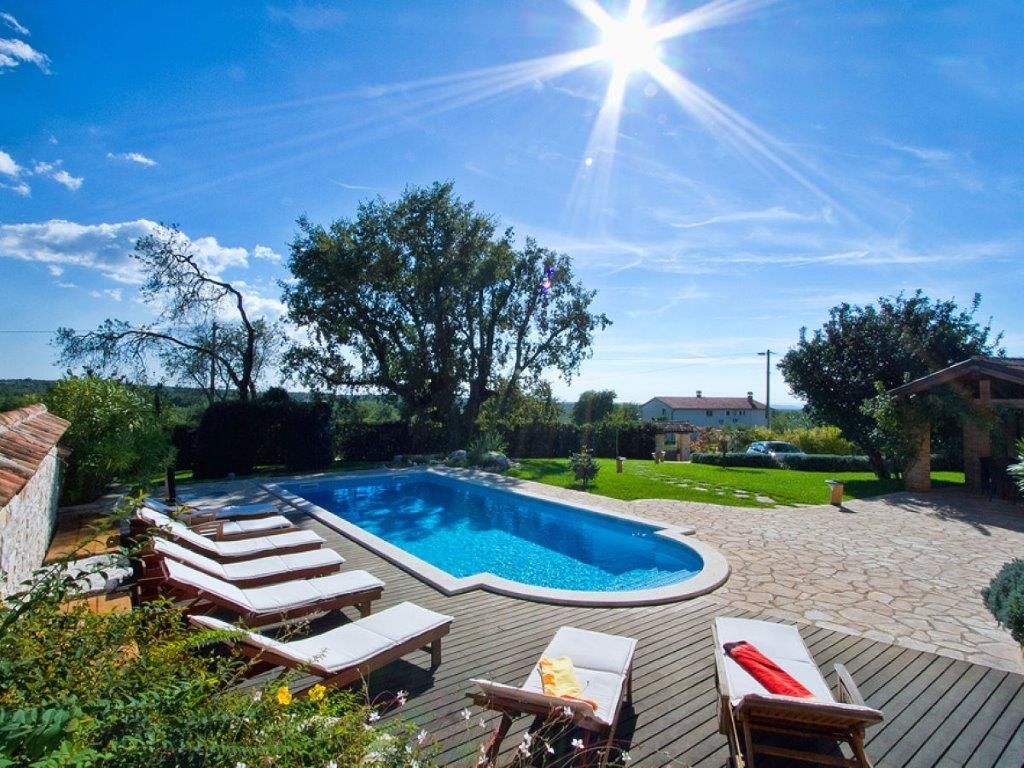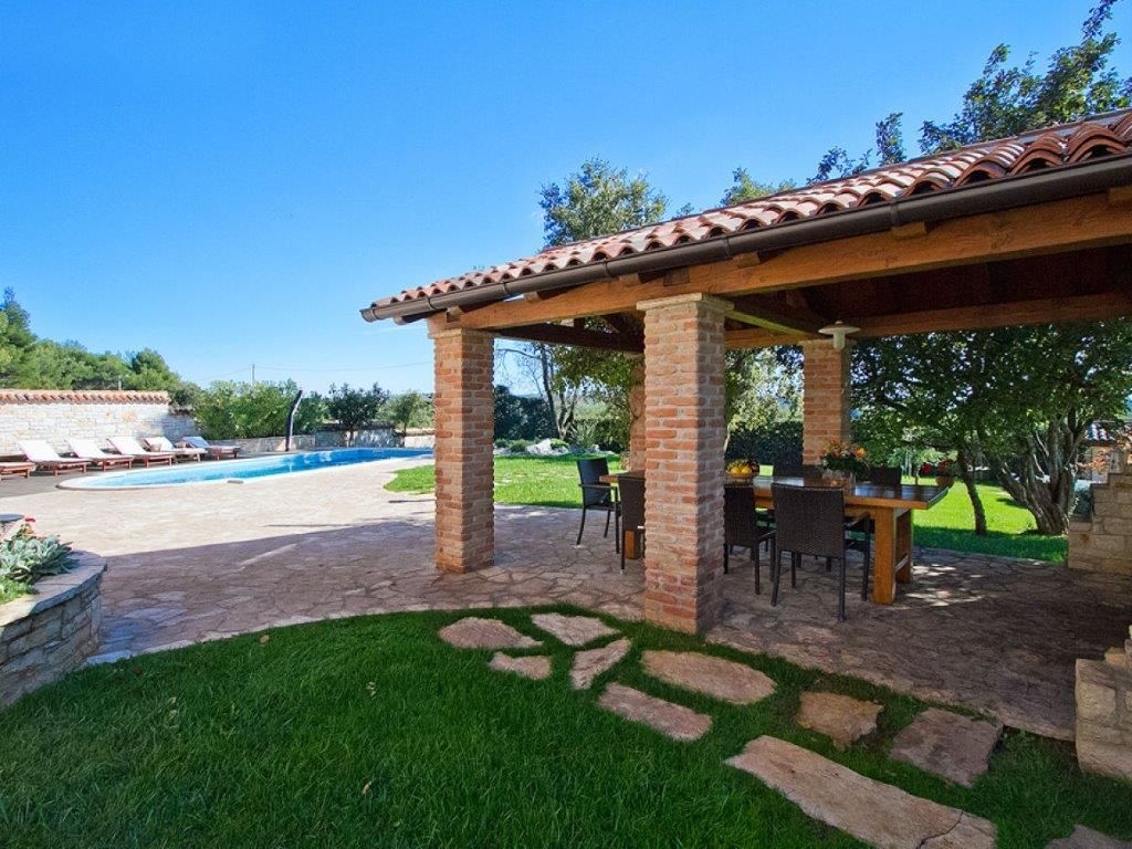 U prostranom vrtu centralno mesto zauzima bazen od 37 m2 s rimskim stepenicama i natkrivena veća letnja kuhinja i trpezarija s istarskim ognjištem. Travnate površine su pokrivene automatskim sistemom za navodnjavanje. Unutar dvorišta je i prostor za parking za dva ili više vozila.