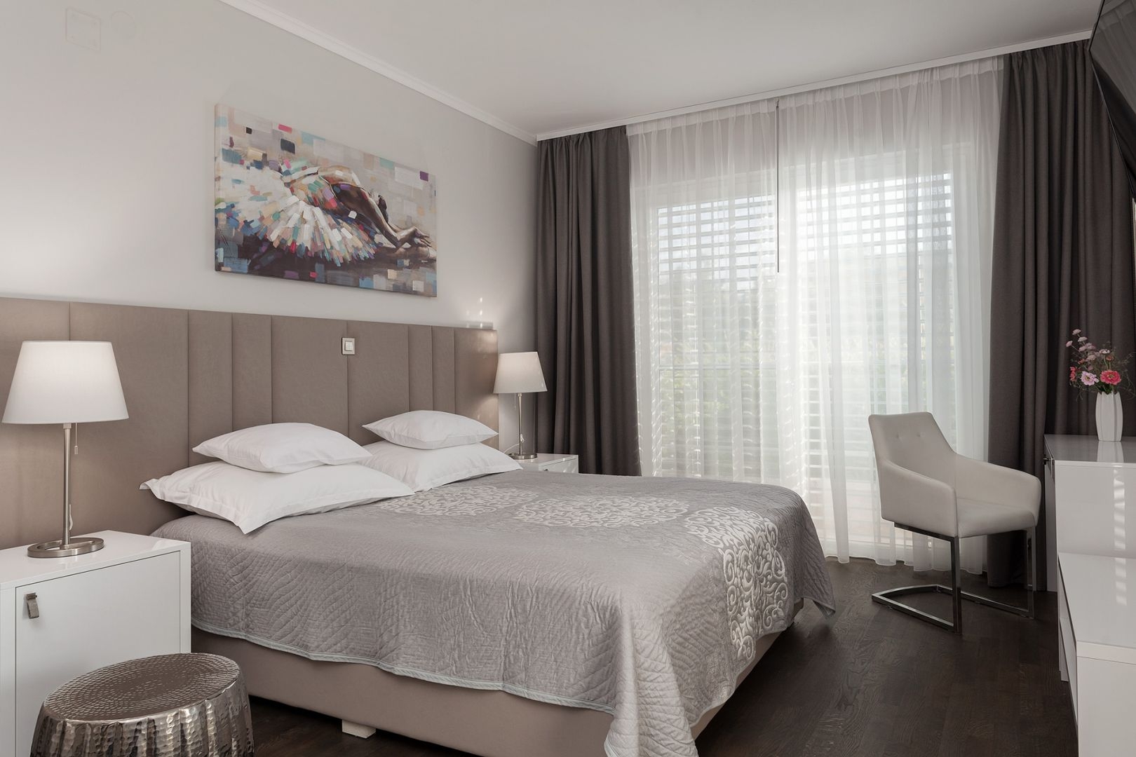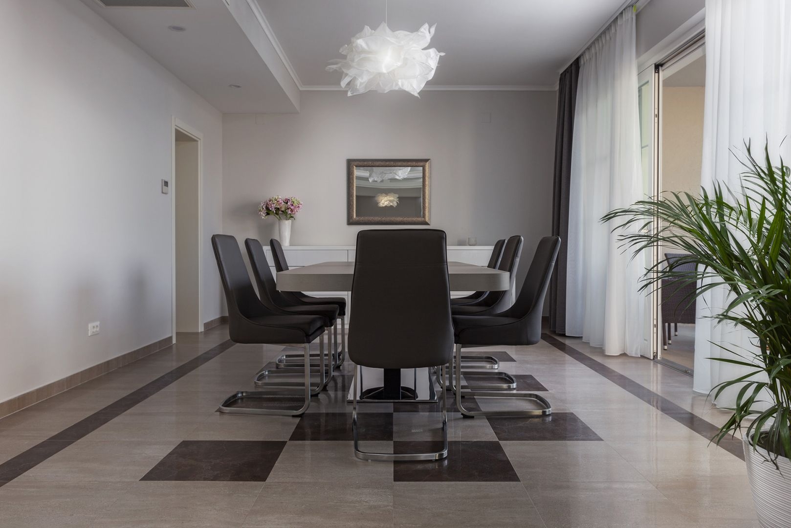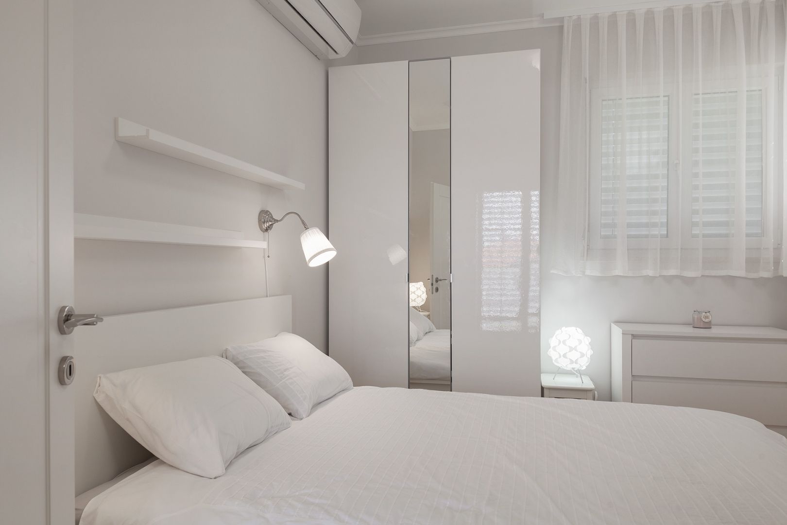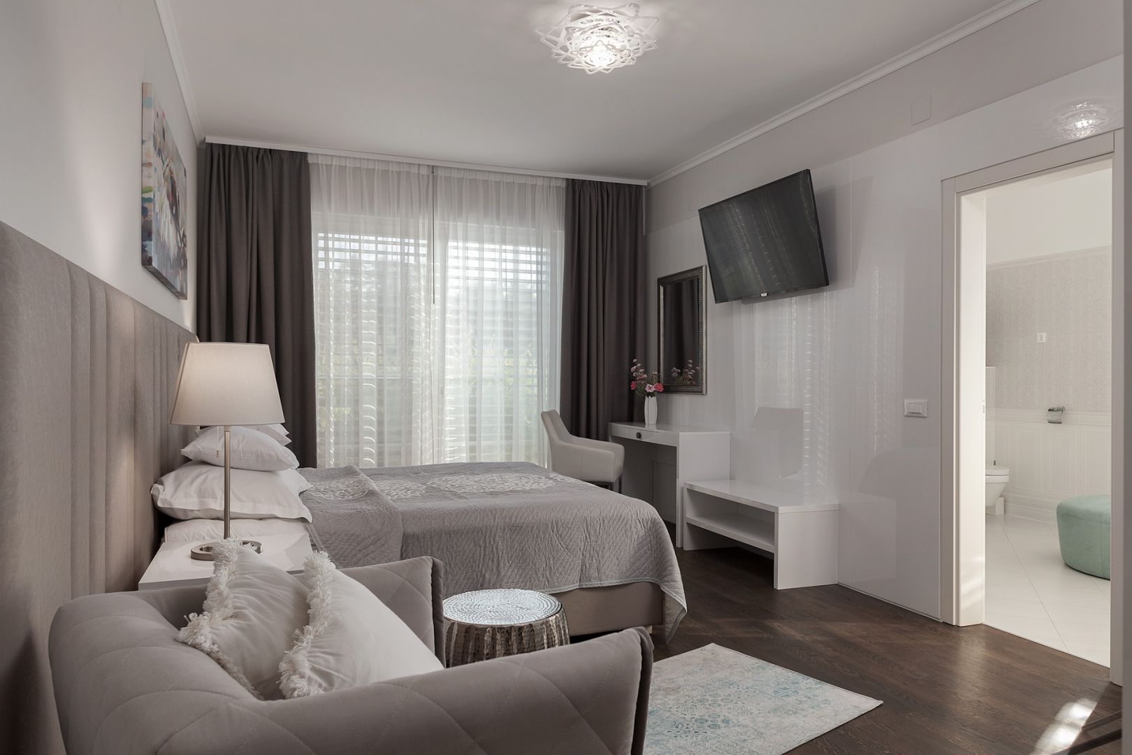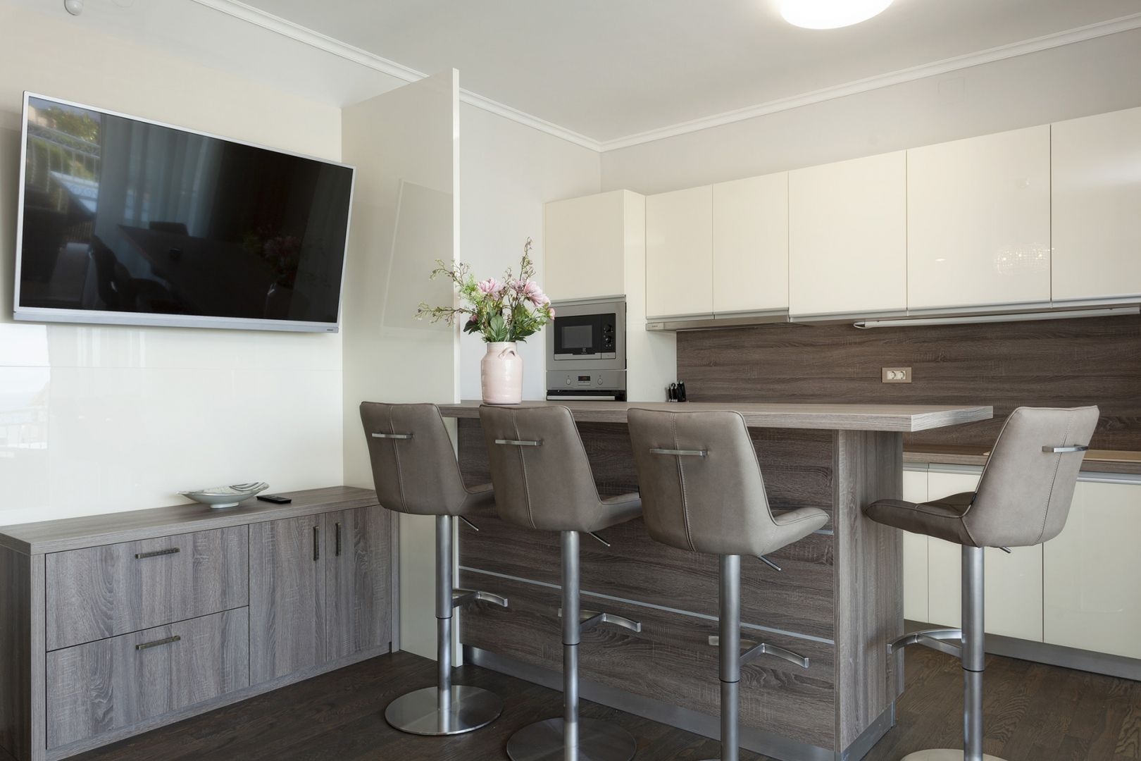 U prizemlju se nalaze kuhinja, trpezarija i dnevni boravak, tri spavaće sobe, od kojih dve manje i jedna master room. Na prvom spratu nalaze se dva luksuzno uređena apartmana, svaki sa svojom vanjskom terasom s pogledom na more. Svaki apartman ima svoje kupatilo kao i tv.