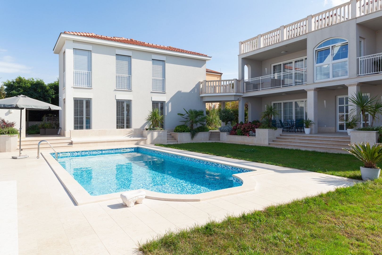 Dvorište je prostrano i lepo sređeno- zelena površina, zasađena palmama i mediteranskim biljem, letnja kuhinja sa frižiderom za osvježavajuća pića i još jedna terasa uz sunčalište. Bazen ima protustrujno plivanje i rasvetu. Ova čarobna vila je kao stvorena za odmor iz snova u kojem sva čula uživaju.